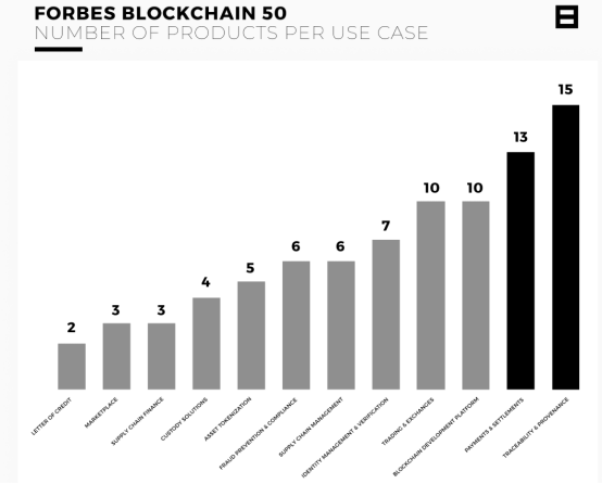 我们的数据显示,在福布斯50强榜单中,有15家公司正在研究解决可追溯性和出处有关的产品。这一用例分布在多个行业,包括农业、矿业、航空航天、食品和汽车等。嘉吉公司(Cargill)是美国最大的私营公司,按收入计算,正在开发一个名为Splinter的开源平台。该平台可以在其供应链中实现 "组织之间保持各方隐私前提下的沟通和交易"(利用各种Hyperledger产品,包括Sawtooth、Grid和Transact等)。同样,生产iPhone和Playstations等消费电子产品的合约制造商富士康也在利用区块链技术,通过区块链金融为其供应商简化融资,其中许多供应商都是中小企业。